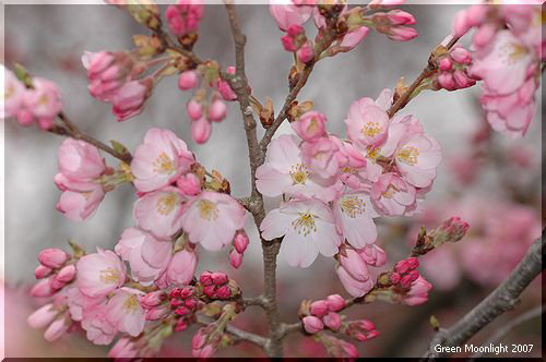 花弁の中央部は白っぽくて外側に紅色のボカシが入る魅力的な桜です。 「これは何かな?」 神代植物公園に原木があるジンダイアケボノ(神代曙)です。 花の大きさは馴染みのあるソメイヨシノとほぼ同じ程度ですね。 実は、素性がハッキリしていないけれども、ヨメイヨシノ系の桜です。 ワシントン市から寄贈という形で逆輸入された選別種が源とされています。 (ちょろっと、蘊蓄) ● 学名 : "Prunus × yedoensis cv. ‘Jindai-akebono’" ● 原産 : (原種) 日本 ● 分類 : バラ科サクラ属 実は、この品種に先行してアケボノ(曙)という大輪の桜が寄贈されました。 ソメイヨシノの実生?から選別されたとされています。 同じワシントン市からの寄贈されました。 神代曙は曙の枝を接ぎ木して育てられ、同じ花が咲くはずでした。 なぜか違う花が咲く別品種と認定され、日本で別名をもらったのだそうです。 不思議なこともあるものですね。 そろそろ咲き始める頃だろうと思います。