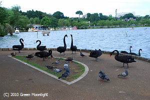 季節はもう夏だと言うのに、水面で遊んでいるのは白鳥と黒鳥ではないでしょうか。アヒルではないですよね(^^*)。まさか、このまま夏のバカンス地と決め込む訳ではないと思いますが、面倒だから、留鳥になってしまおうと相談しているかもしれません。子供がイタズラするのですが、あまり気にも留めずにのんびりしているようです。人間がくれるエサを鳩と取り合っているようでは、もう野鳥の威厳がありませんね。これには秘密があるのですが、それは後で説明します。