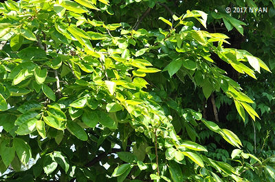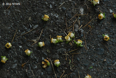 秋に朱色の実をつける柿。その目立たないクリームイエローの花が咲き出すのは春の終わり、もう初夏の風が流れだす頃です。カキノキという表記が名前としては正しいらしいですすが、まぁ、いわゆる「柿」がなる木ですね。同じ木に雌花と雄花が咲き、雄花はあっけなくポロポロと落ちてしまうのだそうです。やがて、緑色の小さな果実ができはじめるのですが、なぜか、これもポロポロと落ちてしまって、赤くなる頃には程良い程度の個数に減ってしまうという訳ですね。柿の木はとても折れやすいので、自分で数量調整をするのかも知れません。