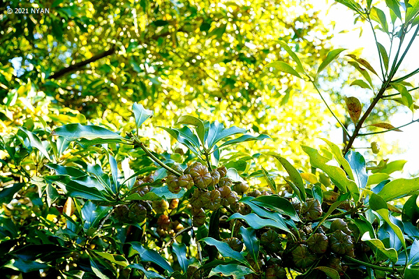独特の果実が膨らませる樹木はシキミ(「樒」または「梻」)です。高さ2~5mの常緑低木(または小高木)で、その枝は神社や寺院で宗教行事に用いられるそうです。濃緑色の力強い葉を持っています。初めて花の姿を観察しましたが、なかなか綺麗です。
