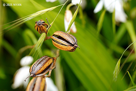 シロバナシラン(白花紫蘭)は品種として扱われている ( f. gebina )、昨年の花由来らしい果実は空っぽだった