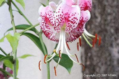 カサブランカの片親としても知られるカノコユリです。きもの生地の染め(絞り染め)技法の名前にもなっています。こんな柄の花が自生している九州や四国はうらやましいですね。でも、美しいが故に、その保護には苦労しているようです。