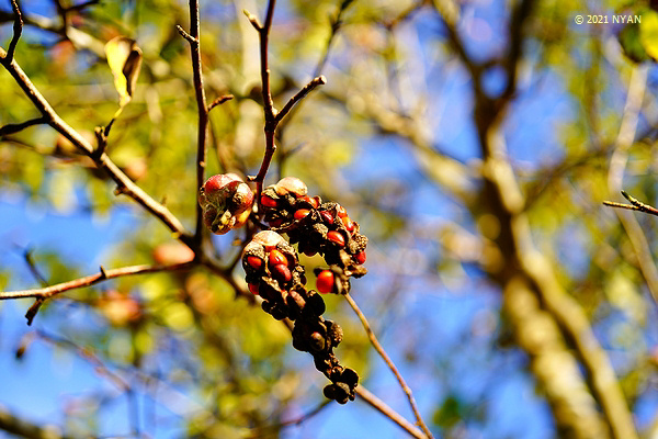 まだ、暑い頃、コブシの袋果と空蝉を撮影していました。その袋果が割れて、内側から朱色の果実が顔をのぞかせています。拳(こぶし、ゲンコツ)のような袋果も不思議ですが、果実が見えている姿も(かなり)妙ですね。