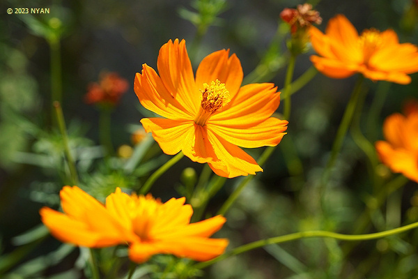 育てやすさと見栄えの良さからか、この季節、キバナコスモスの姿が驚くほどに増えましたね。資料を紐解けば、欧州経由で渡来したのは大正期とのことですが、町にも山にも目に付くようになったのは、前世紀末だったように思っています。 コスモスとは同属の別種に当たり、よく増え、茎がしっかりして花期も長いので、広く好まれるのだろうと認識しています。残念ながら、色の変化は余り多くありませんが、強い橙色系と淡い黄色系、それから、渋いチョコレート色系が見られますね。見たことがないだけで、他の色合いもあるのかも知れませんが、一般には普及はしていません。ありそうで見たことがない白色があれば、組み合わせとして嬉しい気がします。 |