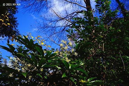 花花がおとなしくなってしまう初冬から正月辺りまで、それまで目立たなかったヤツデに華やかな花が咲きます。まぁ、それでも余り気が付かれないままになってしまうことが多いのですが、少ないチャンスを捉えて、蜂などの冬でも動きまわる昆虫たちが集まってきます。