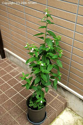 まるでアサガオのように早くから咲き出して、天気の良い日には昼には萎んでしまいます。木が大きくなって、毎日、数個から8個程度の花を付けるようになりました。鉢の大きさが不足して、二度植え替えをしたのです。2006/10/10
