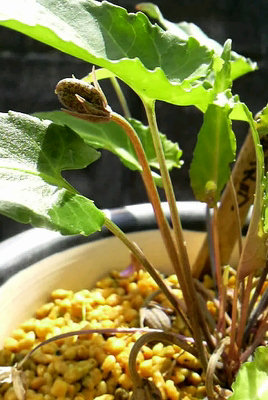 白花変種ですね。葉の鋸歯が粗く、掌状(スプーン状)に凹んでいたので不思議に思い、追加で周辺の通常品の写真を送っていただきました。なるほど!ですね。 (NYAN)