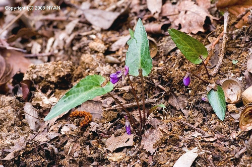この個体は、最初に出逢った場所より少し奥まった山裾で撮影したものです。マキノスミレは一般に大きな群落を作らず、「あっ、ここにも、あそこにも」とぽつりぽつり咲いていることが多いように思います。そういう意味で、ここは比較的多くの個体が密に自生している方なのかも知れませんね。光沢のある濃緑色の葉が細長くて、多くは垂直に立ち上がり、裏面はシハイスミレより薄めの紫色です。典型品で良かったなぁと、つくづく思います。o(^▽^)o